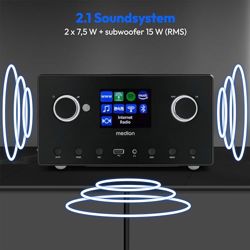 MEDION 2.1 internetradio met subwoofer (DAB+, FM-radio, Spotify Connect, WLAN, Bluetooth, streaming, equalizer, kleurendisplay, USB, AUX, wekker, sluimerfunctie, slaaptimer)